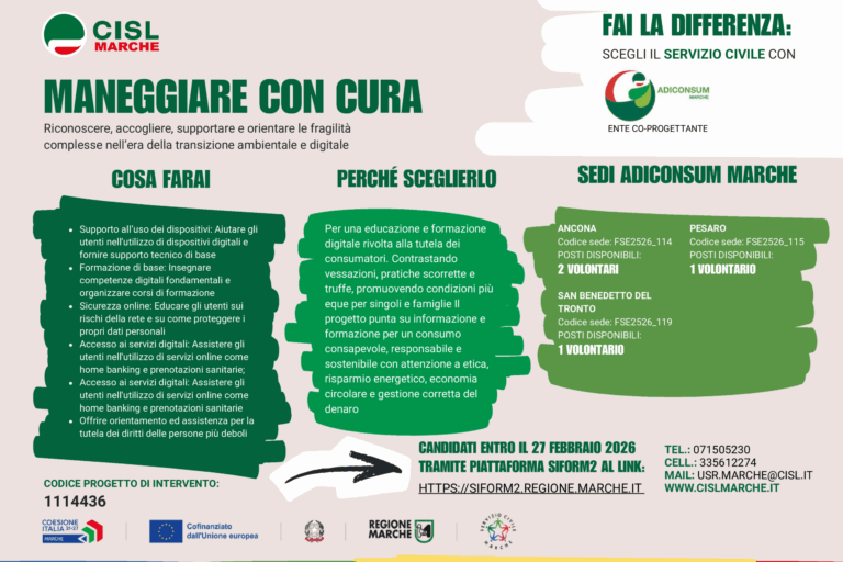 Adiconsum Marche APS è un’Associazione di Consumatori costituita nel 1987, che non ha finalità di lucro e ha come scopo esclusivo di perseguire la tutela dei diritti e degli interessi dei consumatori e degli utenti attraverso informazioni e formazione ai consumatori e ricorrendo a procedure stragiudiziali di risoluzione delle controversie, in particolare attraverso lo strumento della conciliazione.