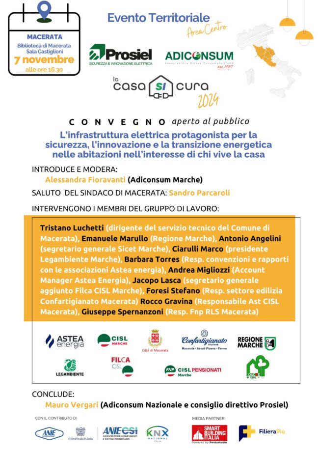 Giovedì 7 novembre presso la Sala Castiglioni della Biblioteca di Macerata, dalle ore 16:30 alle 19:30, si terrà un incontro per sensibilizzare i consumatori sul tema della sicurezza elettrica e dell’innovazione tecnologica nell’ambito del progetto “Casa SI CURA”, promosso da Prosiel in collaborazione con Adiconsum. La “Casa SI Cura” è una campagna di sensibilizzazione…