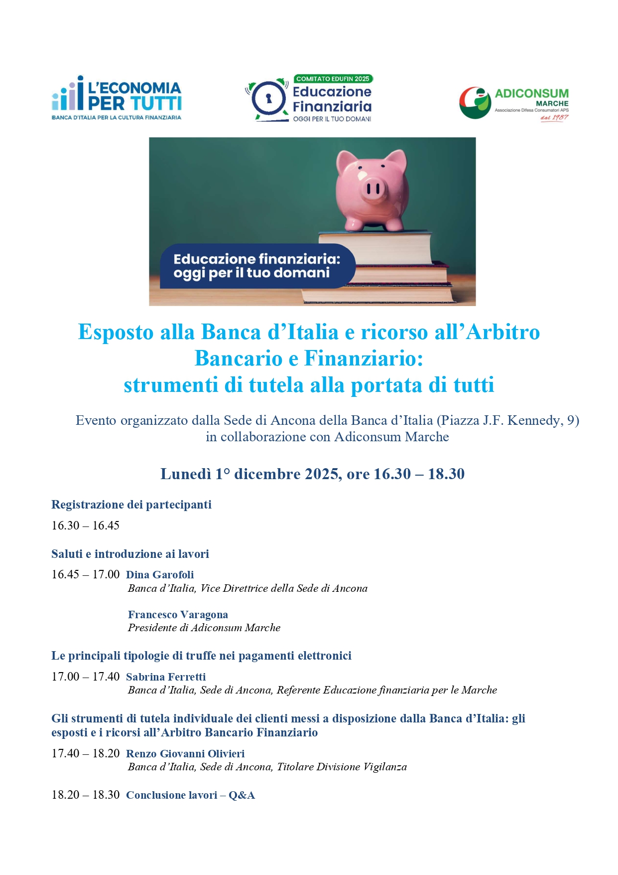 Ti invitiamo a partecipare all’incontro pubblico organizzato dalla Banca d’Italia in collaborazione con Adiconsum Marche dal titolo “Esposto alla Banca d’Italia e ricorso all’Arbitro Bancario Finanziario: strumenti di tutela alla portata di tutti”