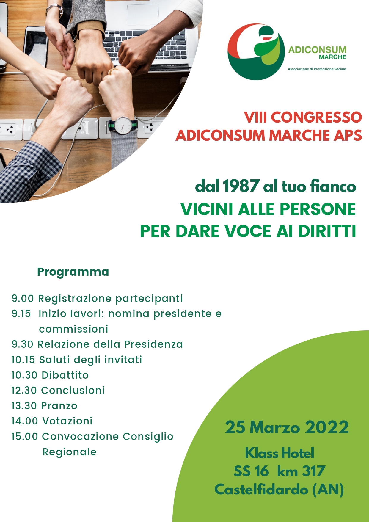 “Vicini alle persone per dare voce ai diritti” è lo slogan dell’VIII Congresso regionale di Adiconsum Marche APS , che si terrà venerdì 25 marzo 2022 alle ore 9.30 presso il Klass Hotel, SS16 – km 317, Castelfidardo (AN).